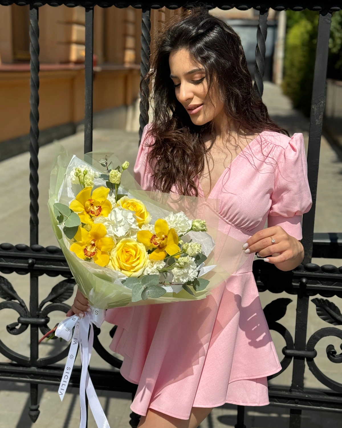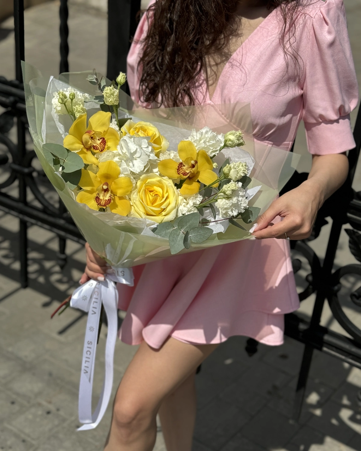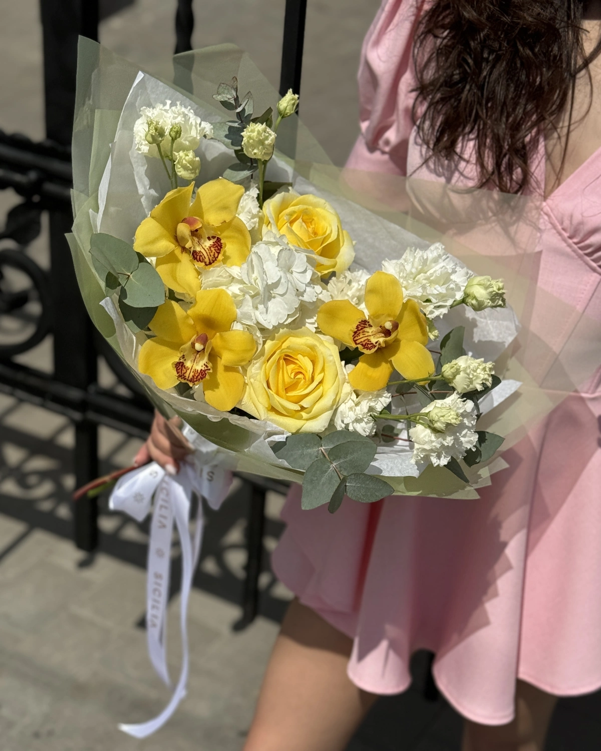 Все букеты собираются подобными, с сохранением стилистики и цветовой гаммы.