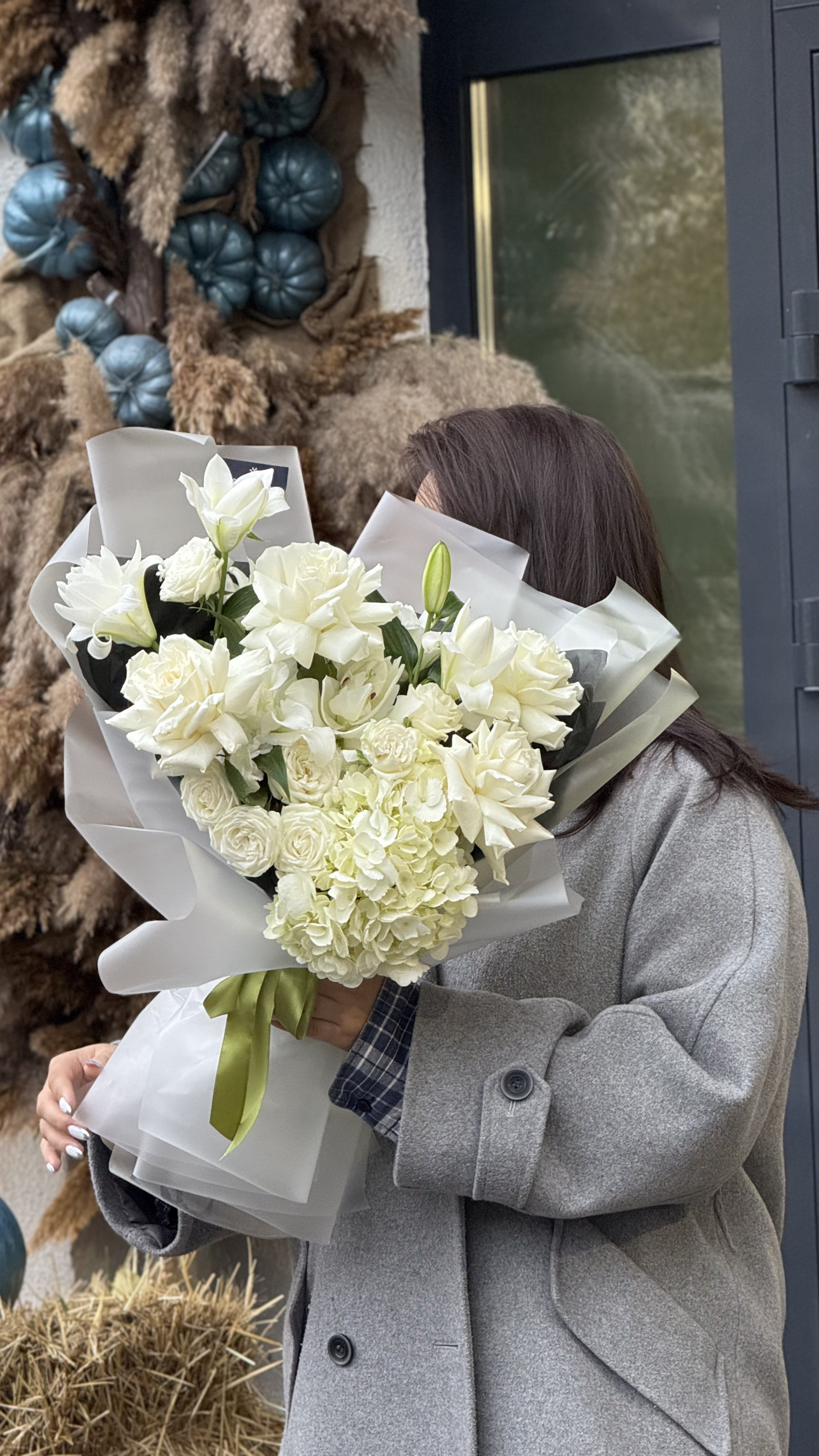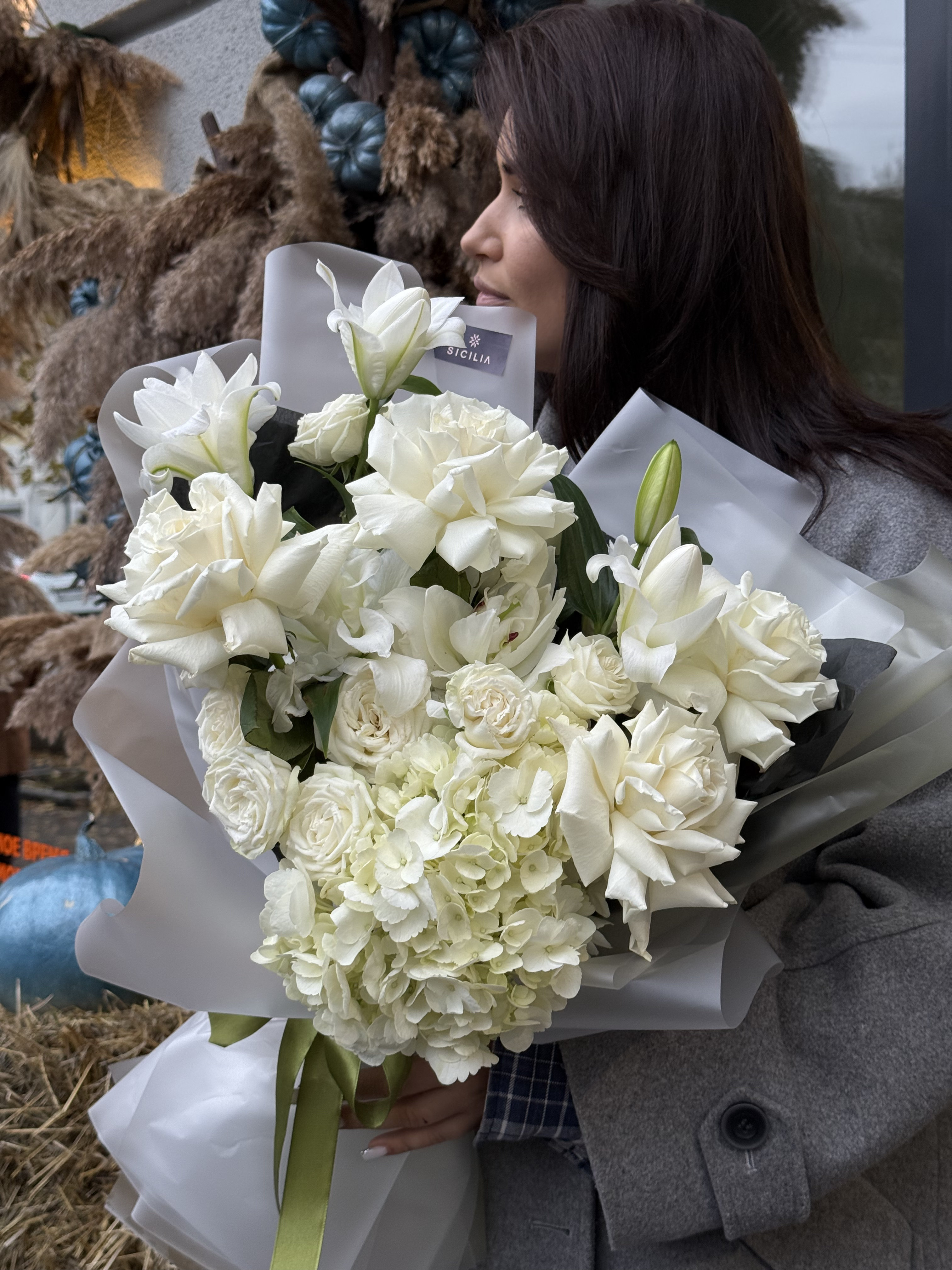 Все букеты собираются подобными, с сохранением стилистики и цветовой гаммы.