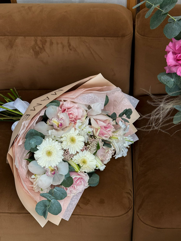 Все букеты собираются подобными, с сохранением стилистики и цветовой гаммы.
