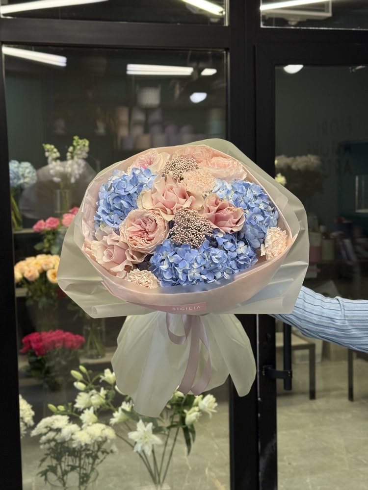 Все букеты собираются подобными, с сохранением стилистики и цветовой гаммы.